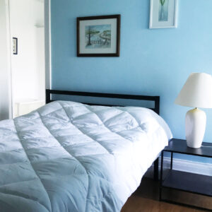 All single rooms in the annex wing of SunCliff on the Lake feature a single bed with a desk/chair, sink with mirrored medicine cabinet, toilet with privacy lock (shared with adjacent room). Showers can be found in a bathroom in the same hall. Additional rooms in the mansion such as the morning room and library (pictured above) are also available to you during your stay.
